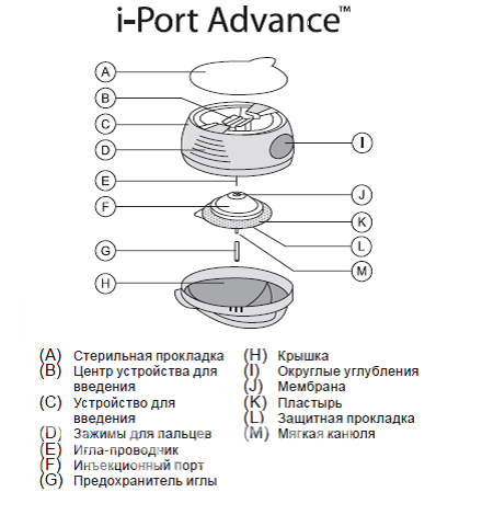 • Верхняя, надкожная часть - это защитный пластиковый корпус, в котором спрятана резиновая мембрана. Для беспрепятственного доступа иглы к мембране в пластиковом корпусе предусмотрено отверстие. На кожу АйПорт крепится при помощи прочного пластыря.