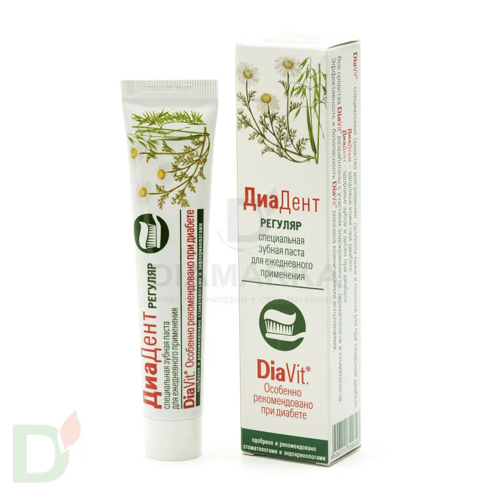 <h2>Ваша полость рта под защитой DiaVit</h2> Продукция ДиаВит нацелена на устранение и профилактику свойственных для диабетиков проблем кожи и полости рта. Кремы ДиаДерм эффективны в борьбе с сухостью, воспалениями, шелушениями, трещинками и опрелостями. Они отлично питают, восстанавливают и увлажняют кожу. В то время как линейка ДиаДент не просто борется с бактериями, живущими в полости рта, но и укрепляет десны, устраняет их кровоточивость, уменьшает проявления ксеростомии и освежает дыхание.<br> <h2>Линейка DiaDent обеспечит здоровье полости рта</h2> Средства с пометкой "Регуляр" идеальны для повседневного ухода за зубами и деснами, а продукты "Актив" рекомендуется в периоды обострений, когда десны воспаляются, болят и кровоточат.<br> <h2>Состав зубной пасты ДиаДент Регуляр</h2> вода, глицерин, диоксид кремния, сорбитол, ПЭГ-600, натрия лаурилсульфат, полоксамер 188, метилурацил, гидроксиэтилцеллюлоза, ароматизатор, бутиленгликолевый экстракт овса, натрия сахарин, титана диоксид, натрия аскорбилфосфат, витамин Е-ацетат, D-пантенол, аллантоин, натрия фторид, сополимер ВП/ВА, ментол, тимол, натрия метилпарабен.
