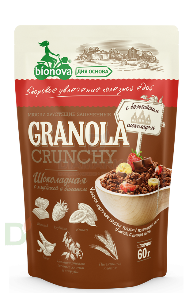 Мюсли Bionova Шоколад-Клубника запеченные хрустящие, 60г